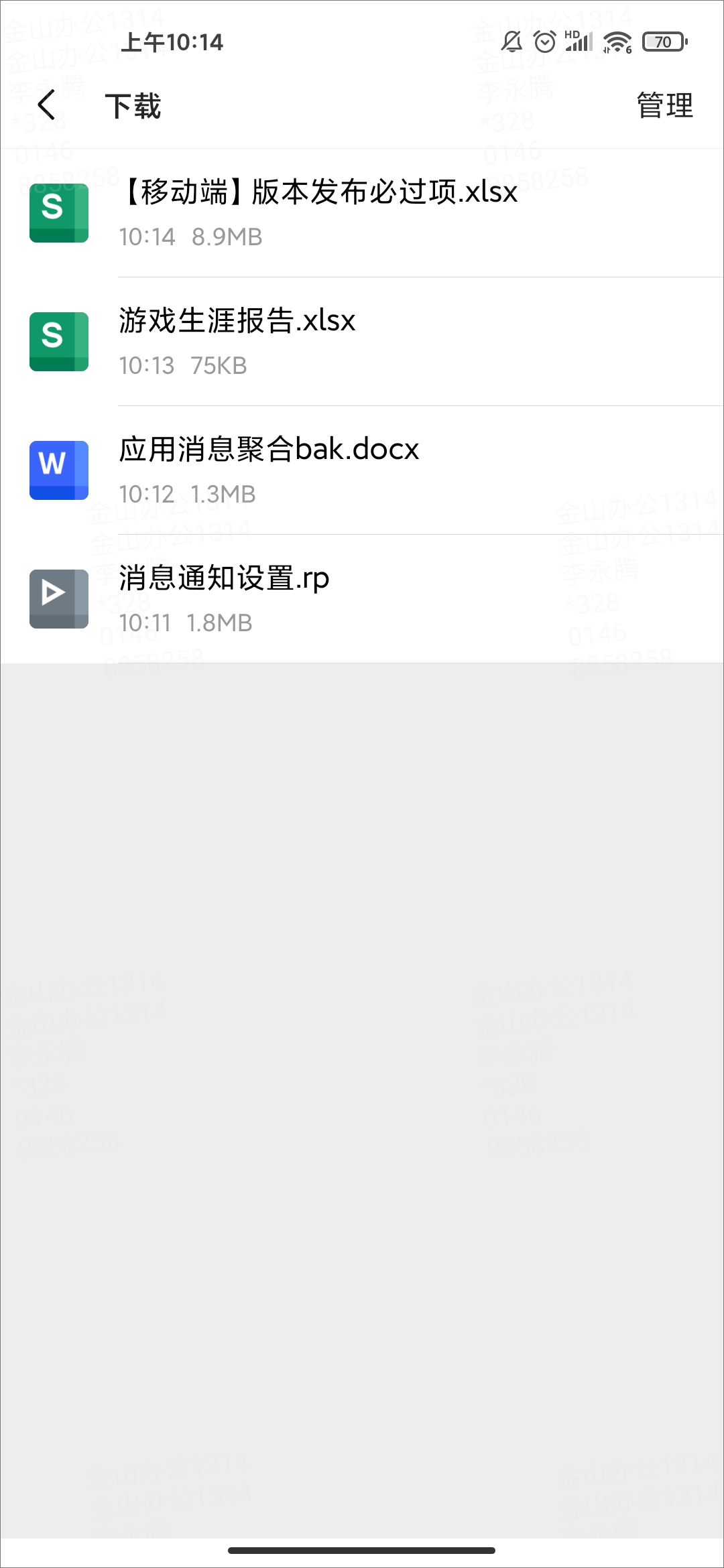 显示聊天中下载到本地的文件列表,包含文件名称、下载时间、文件大小等信息。