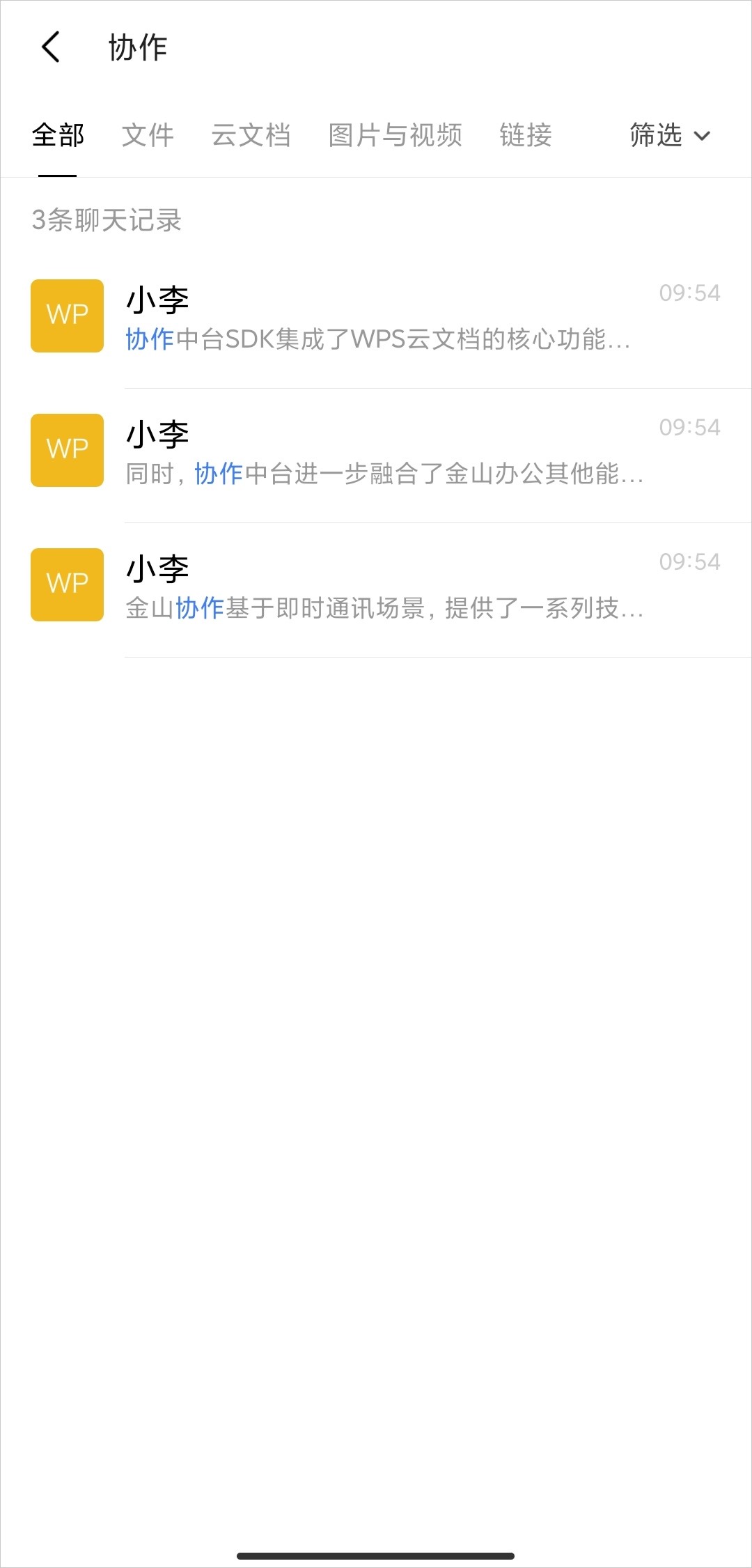 SDK 默认实现了聊天记录、云文档、联系人、文件等类型的搜索实现。实现了关键字命中高亮,点击跳转,长按菜单等实现。