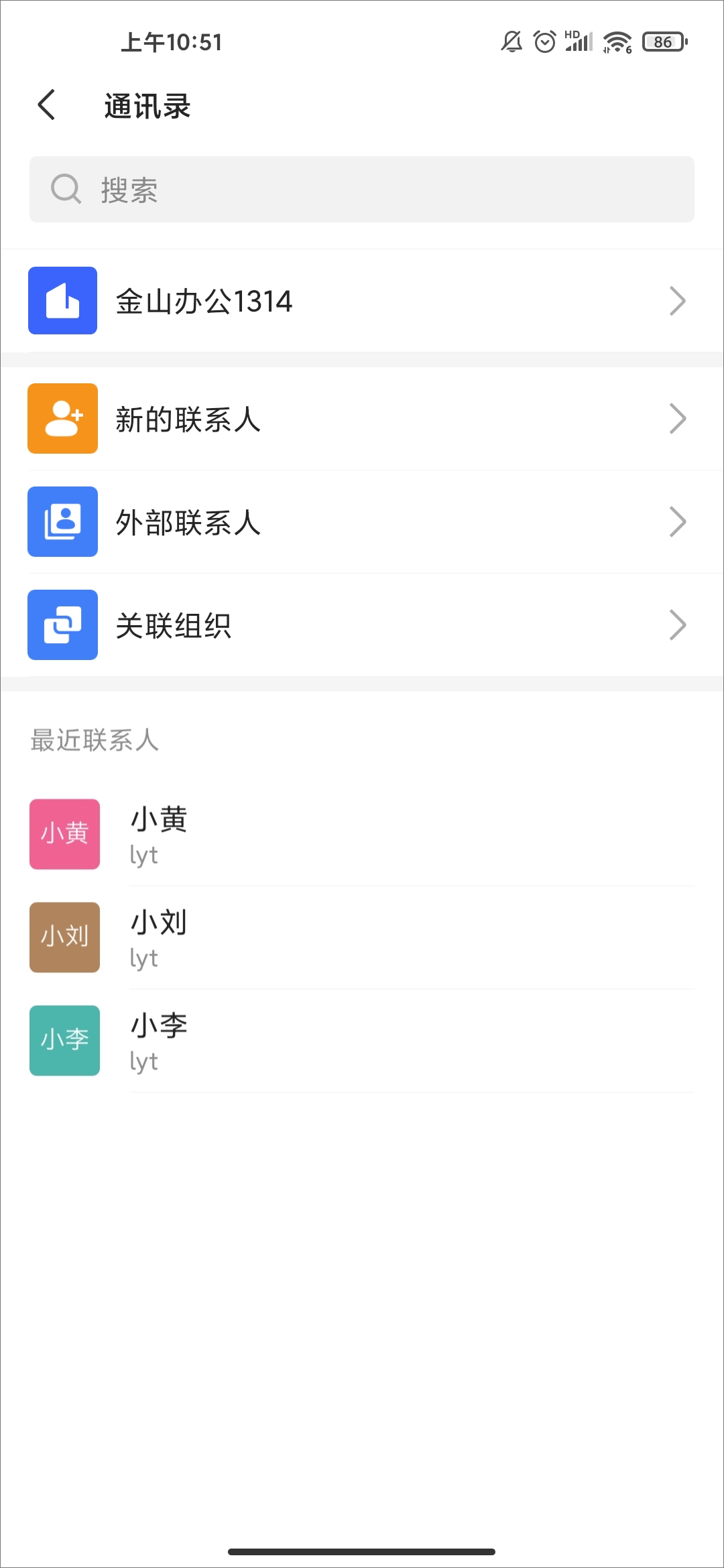 通讯录页面提供企业组织架构和最近联系人。点击企业成员可查看用户名片。