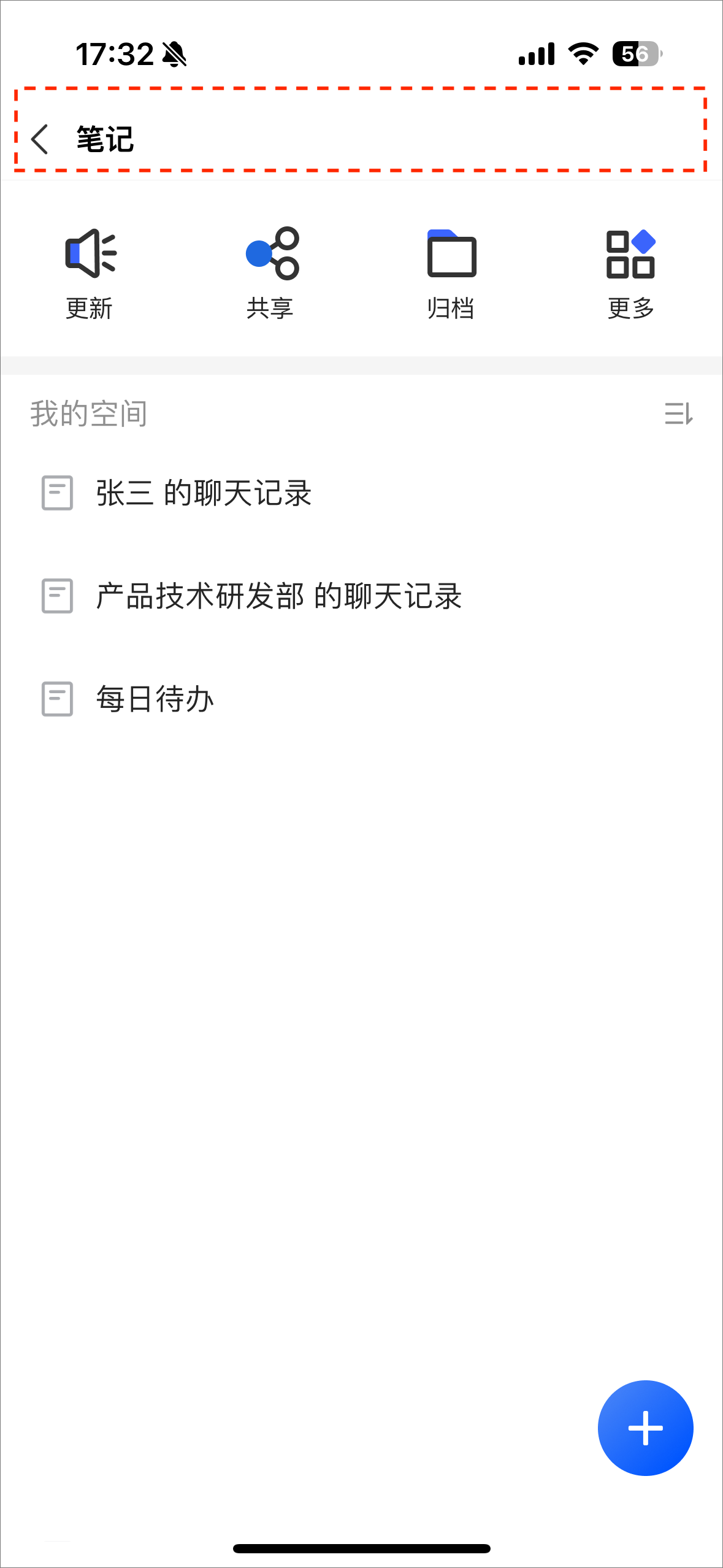 笔记列表标题栏默认展示了标题及右侧搜索按钮。可通过实现 KIMNoteHomeViewControllerDelegate 的 configTitleView 协议方法来自定义标题栏的展示及点击事件。