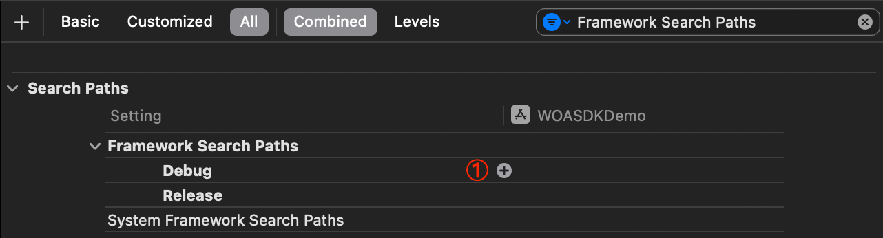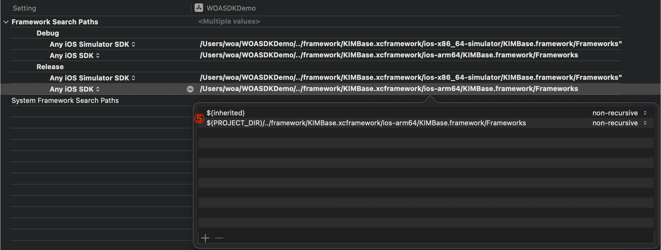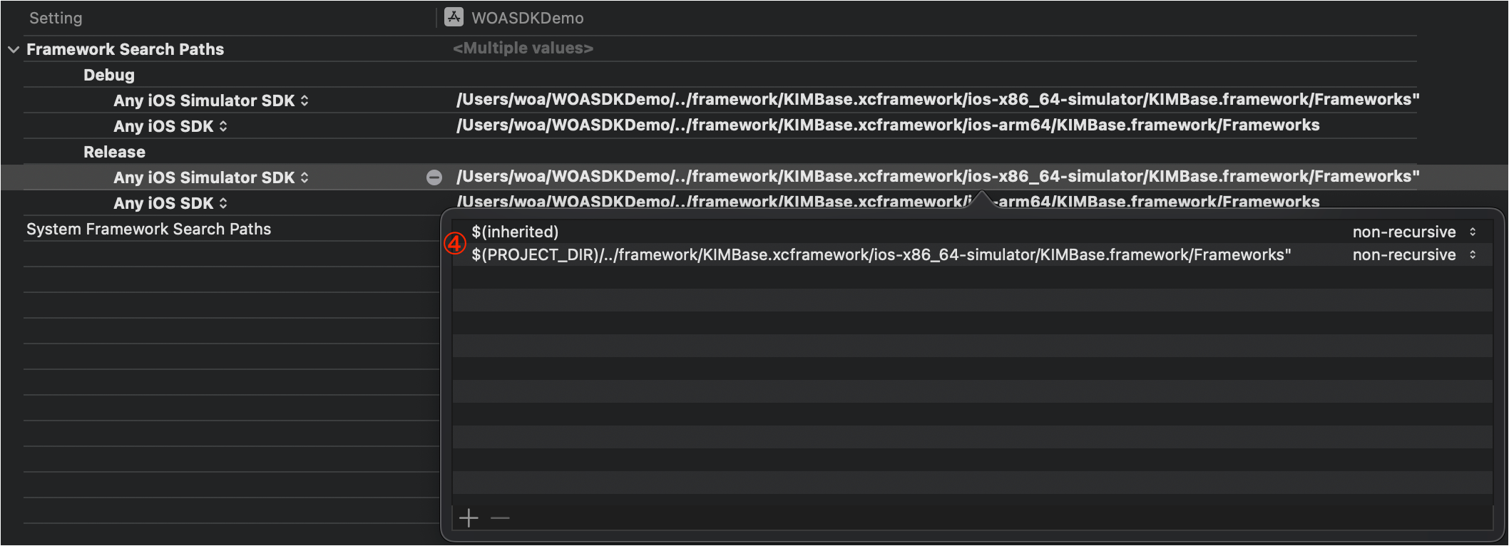 b. 在 Build Settings -> Search Paths -> Framework Search Paths 中添加KIMBase.framework 模拟器与真机的搜索路径, 具体步骤如下:
