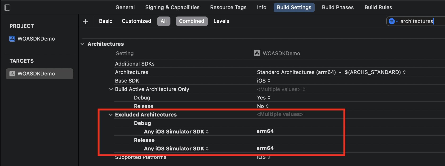 c. 在 Build Settings -> Architectures -> Excluded Architectures 中设置 Any iOS Simulator SDK 中填入 arm64 以支持m系列芯片的模拟器运行。如下图所示: