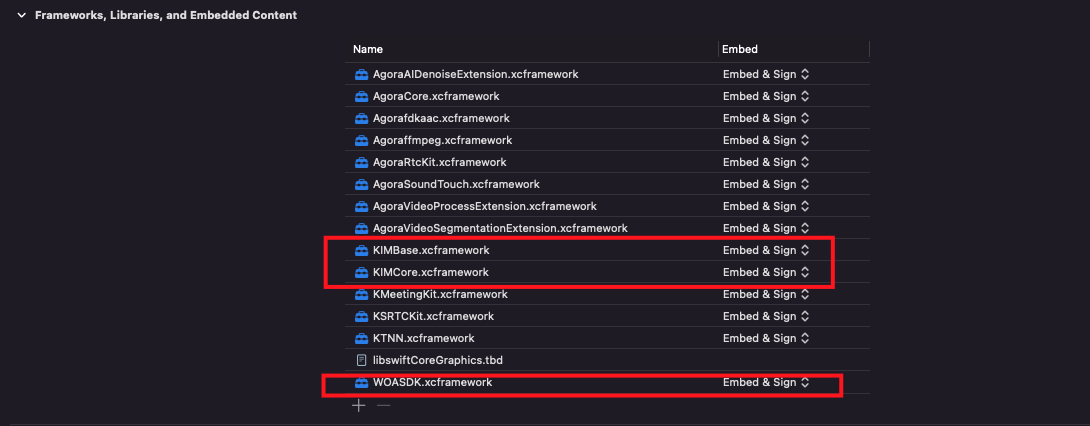 a. 在 General -> Frameworks,Libraries,and Embedded Binaries 中,将 SDK 所需的 xcframework 全部改为 Embed & Sign。如下图所示: