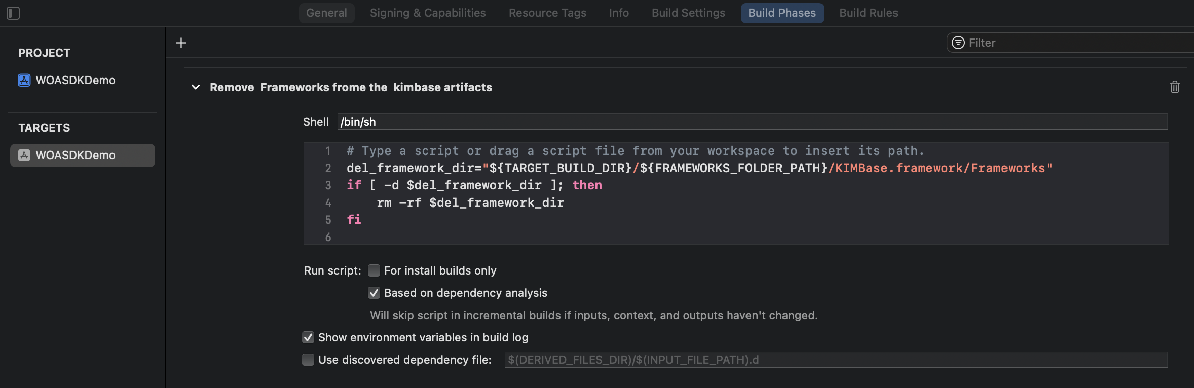 d. 为避免苹果审核被拒风险,在Build Phases中添加以下脚本: