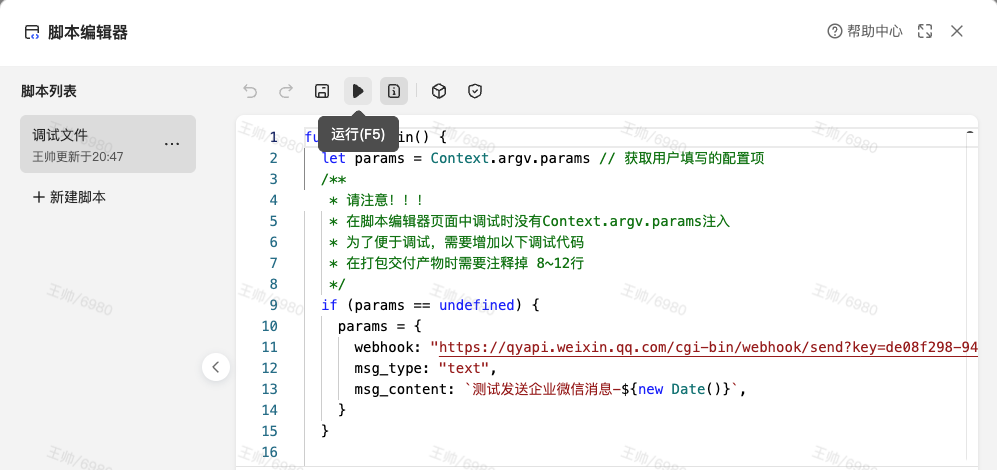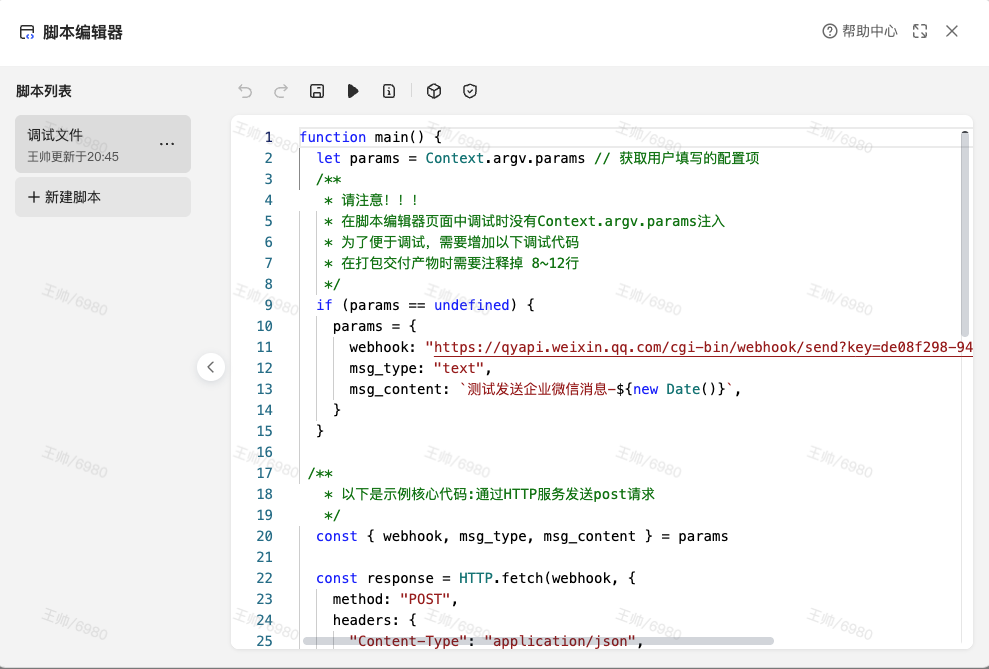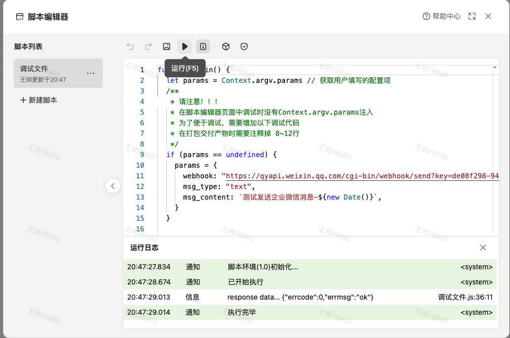 在template.json (模板配置文件)章节中,我们通过成功渲染了配置页面,方便用户填写配置项。下面我们用脚本来实现"发送企业微信群聊消息"的核心逻辑: