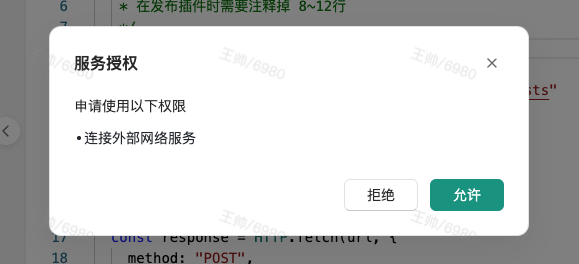 - 由于示例中使用了HTTP服务,根据提示,要添加相关授权