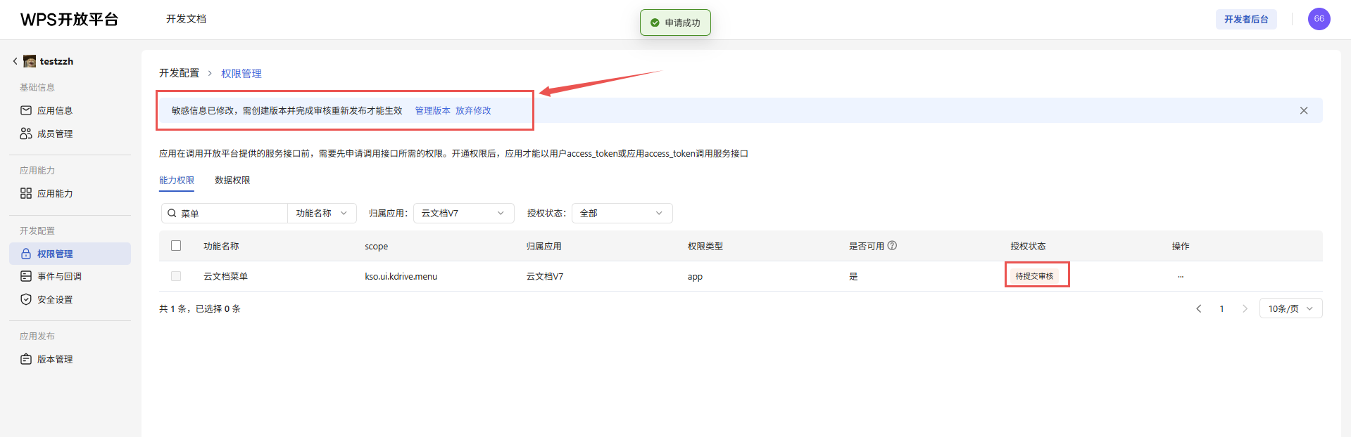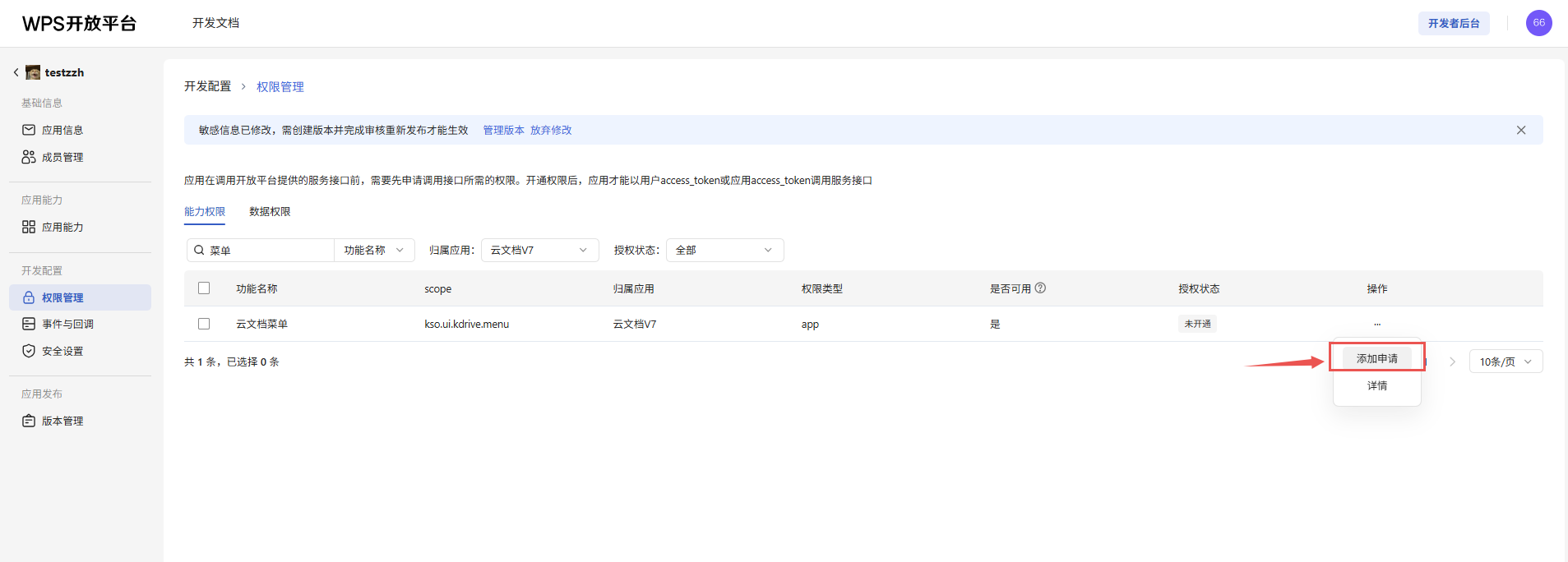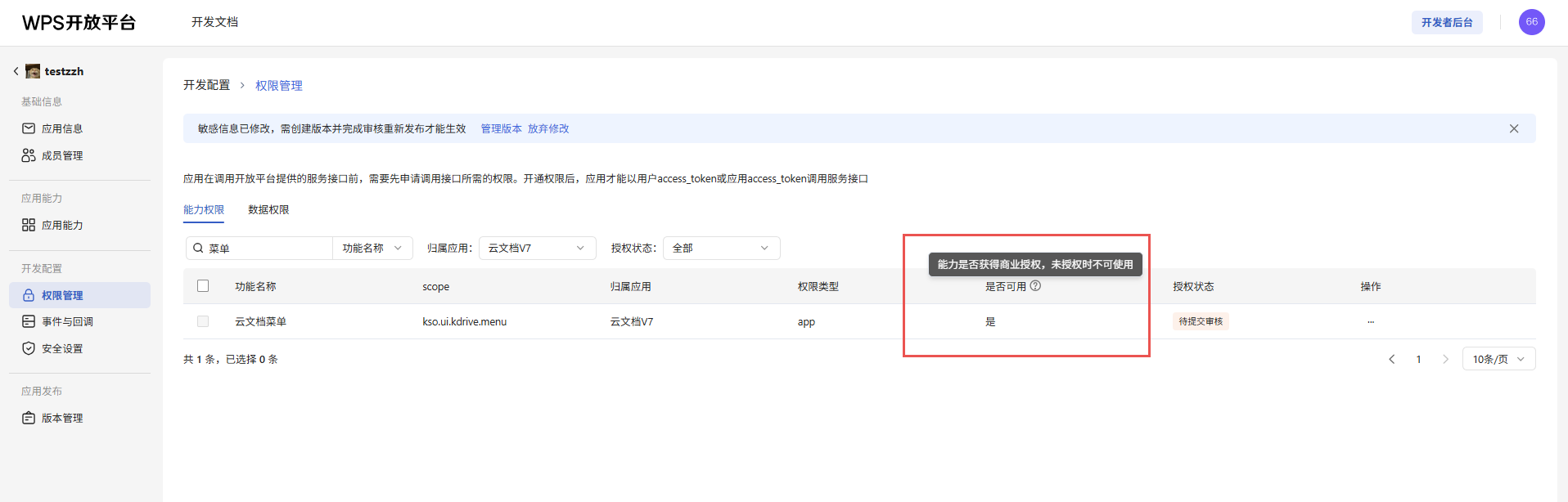- 若”是否可用“状态为”否“,说明当前环境未获得该能力权益,可联系PM申请开通