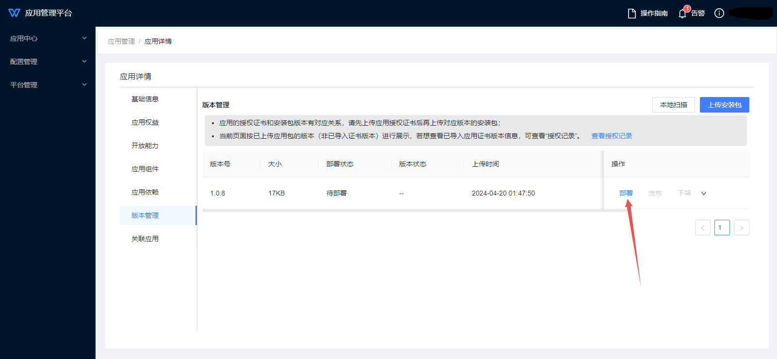 2.若应用已执行过安装包上传和安装,则可对最新安装的版本执行部署操作: