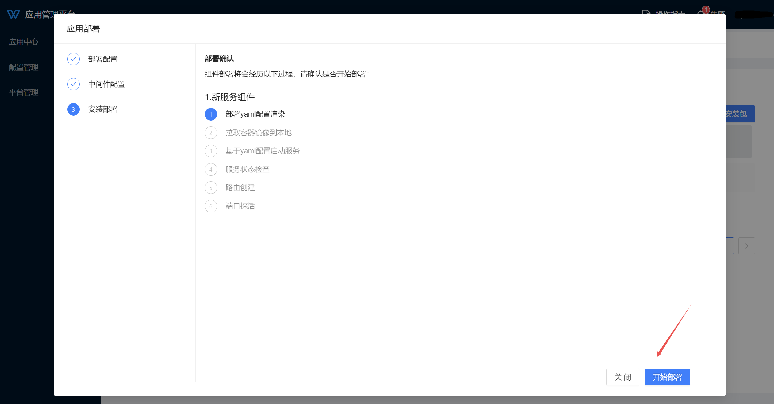 1、部署配置、中间件初始化完成,点击[开始部署],开始执行部署。(低版本功能操作存在差异:在版本“操作”列点击[部署]即可进行部署)