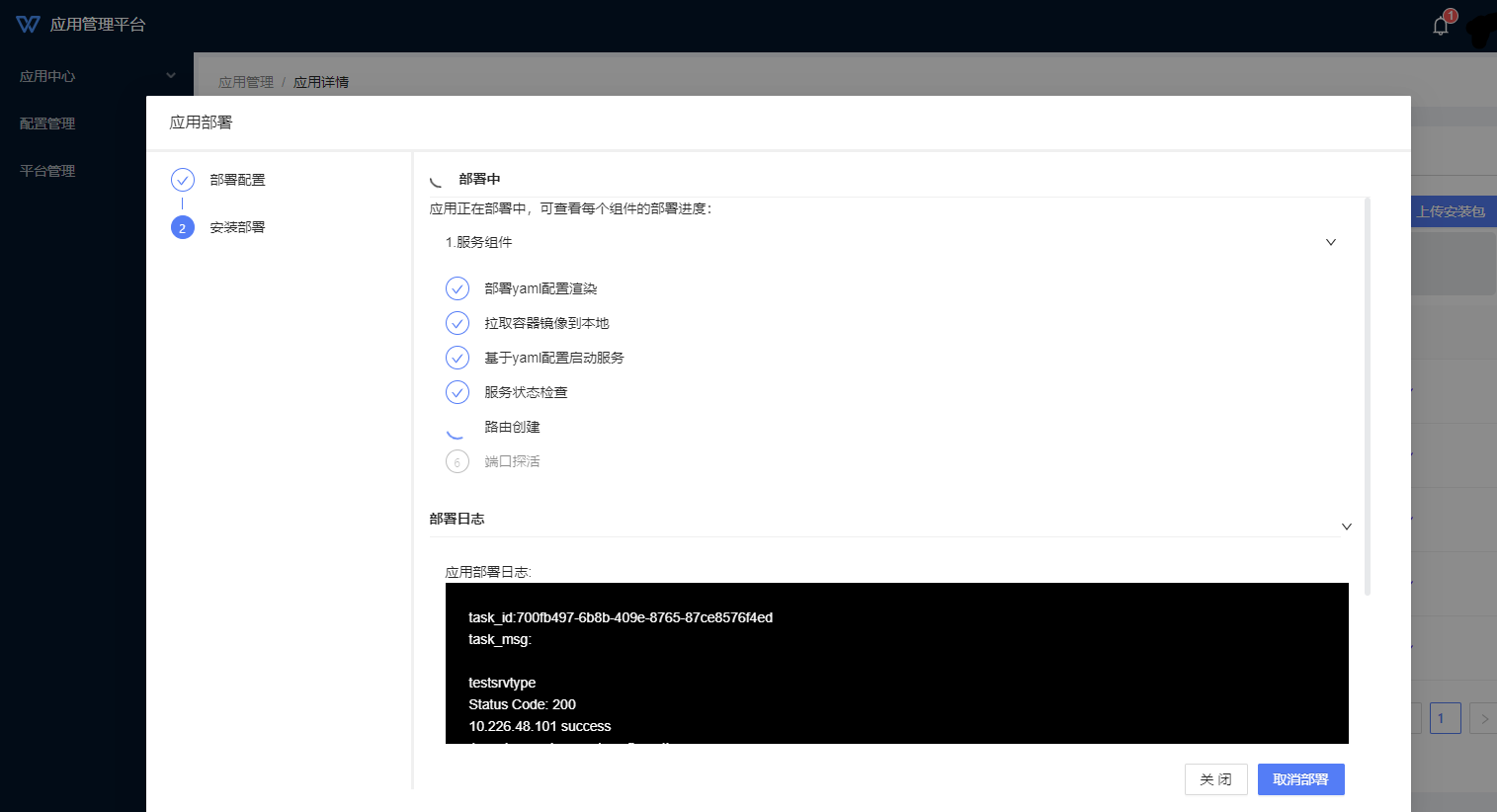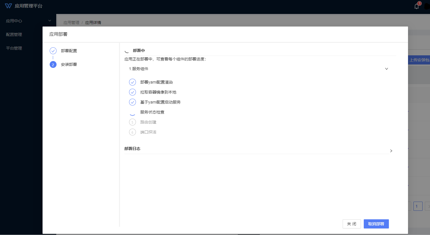 2、部署过程会中,会展示每个组件的详细部署进度: