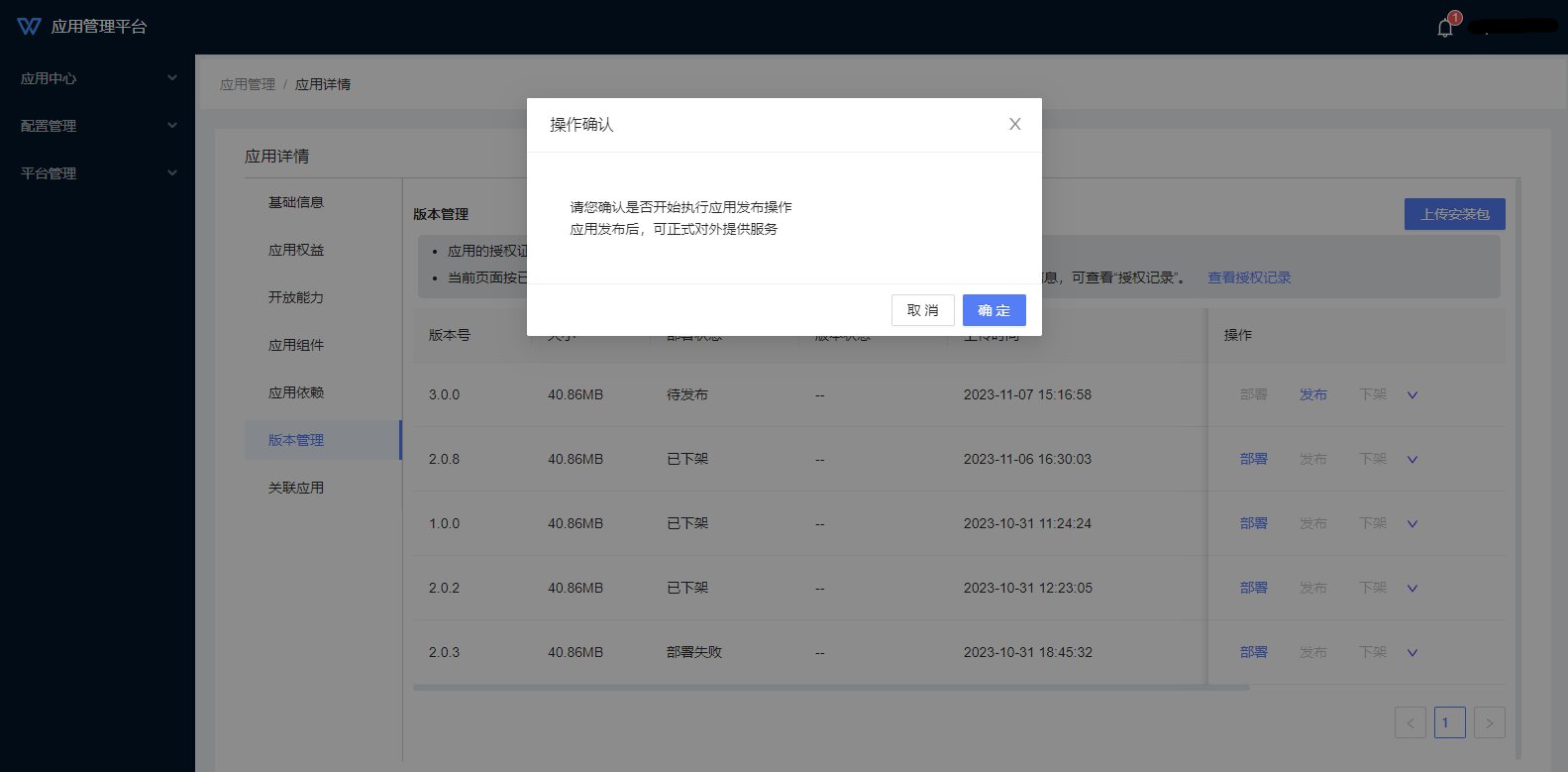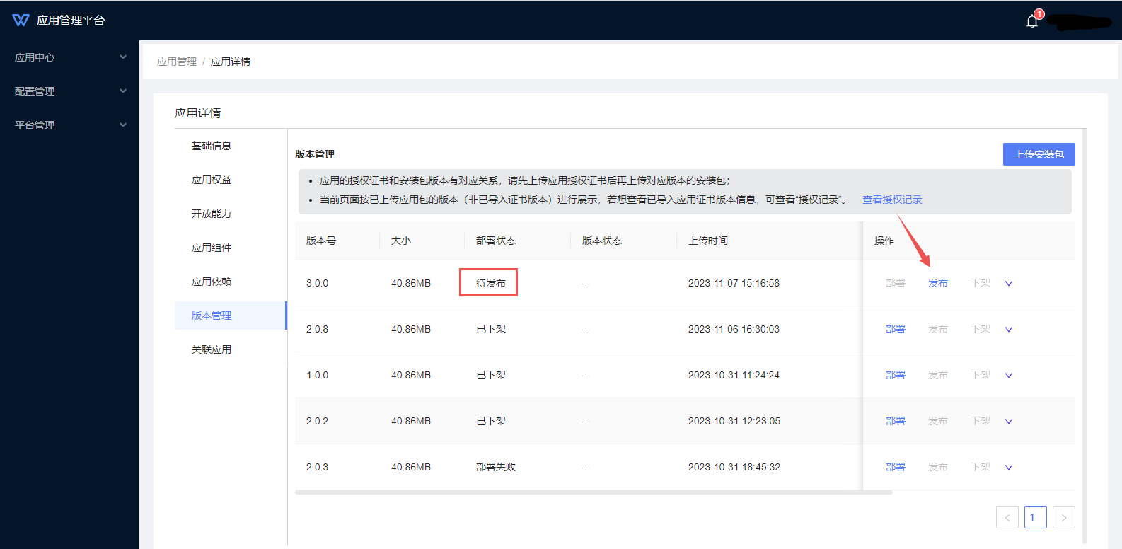 1、应用部署成功后,版本处于“待发布”状态,点击“发布”进行版本的发布操作:
