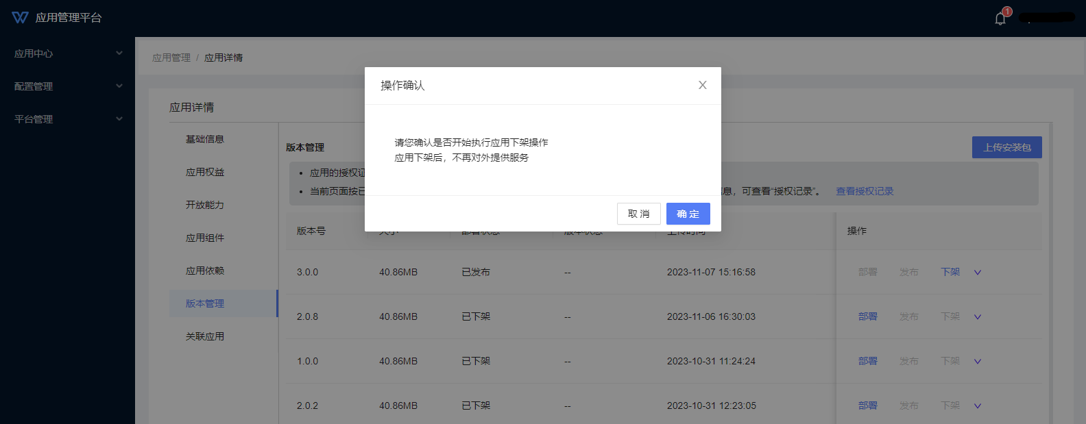 1、“已发布”的版本可进行版本下架,下架后版本不可对外提供能力;