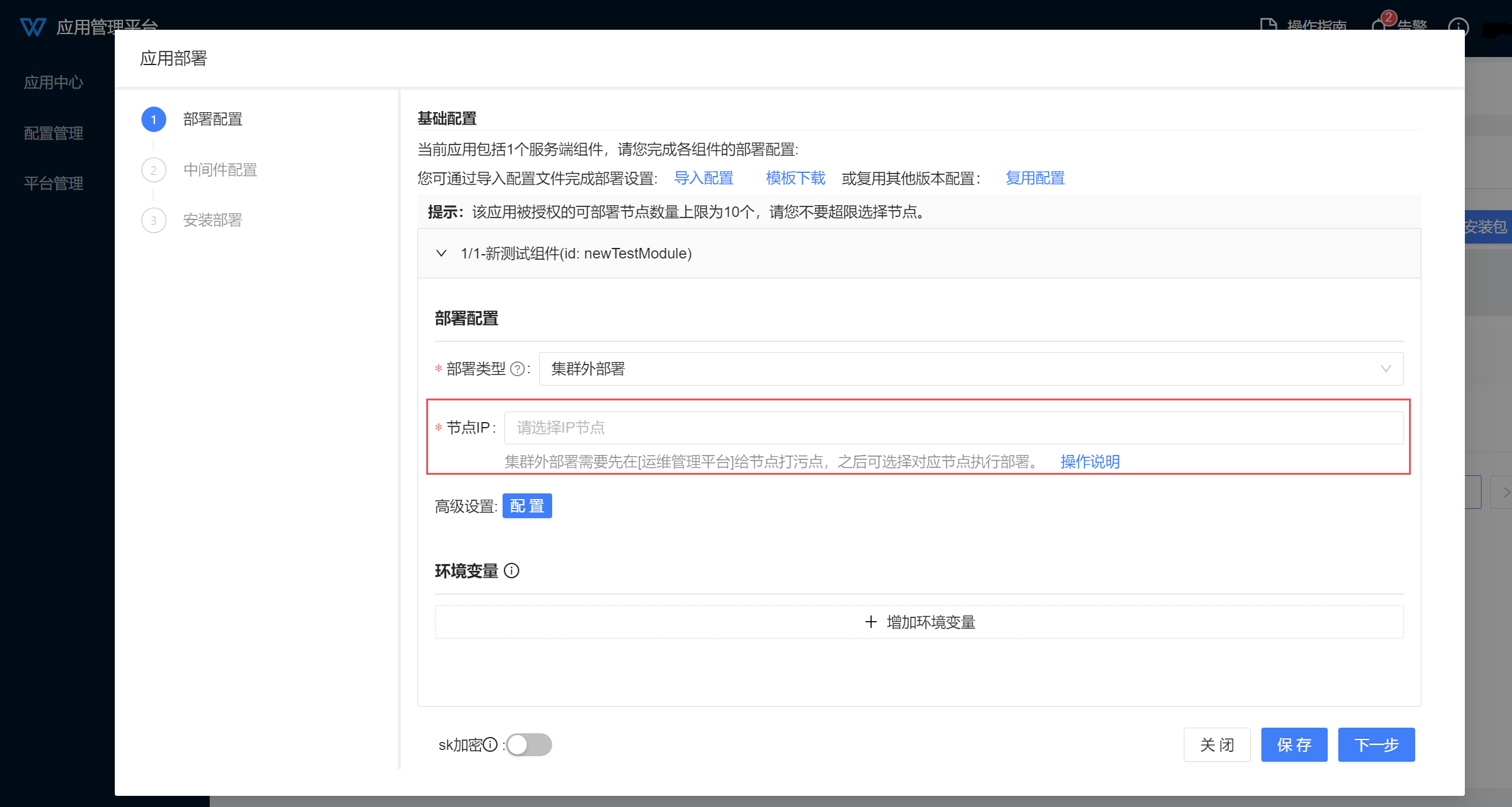 选择“集群外部署”,可选择集群外的节点。(需要提前在运维平台为节点打污点,详见操作提示)