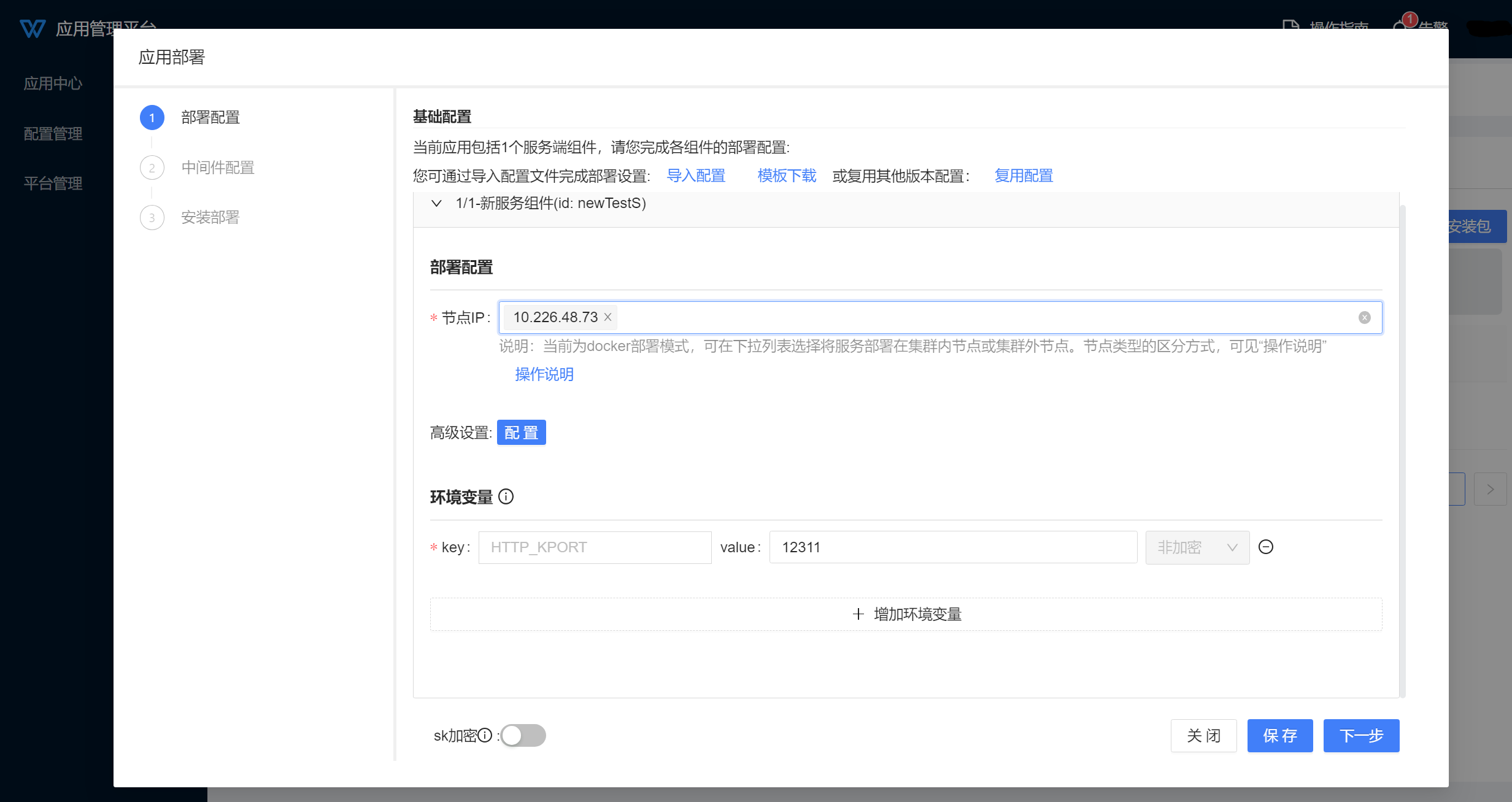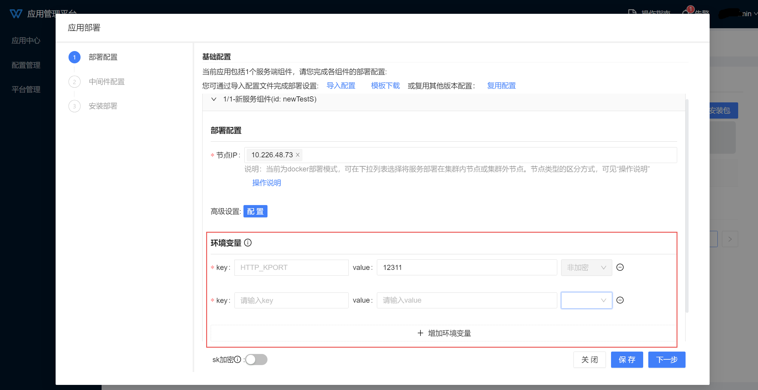 - 服务组件部署时,可能需要进行环境变量配置,可按需进行环境变量配置,平台会将环境变量传递给服务部署的容器
