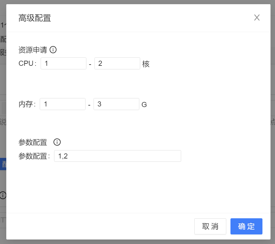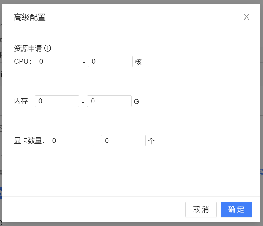 若应用对部署资源有明确需求,可点击[高级设置]的配置进行管理。可配置服务对硬件资源的申请下限和使用上限,若服务实际使用资源超出范围,所在容器会被删除;配置为空或0,平台不对该资源进行设置。
