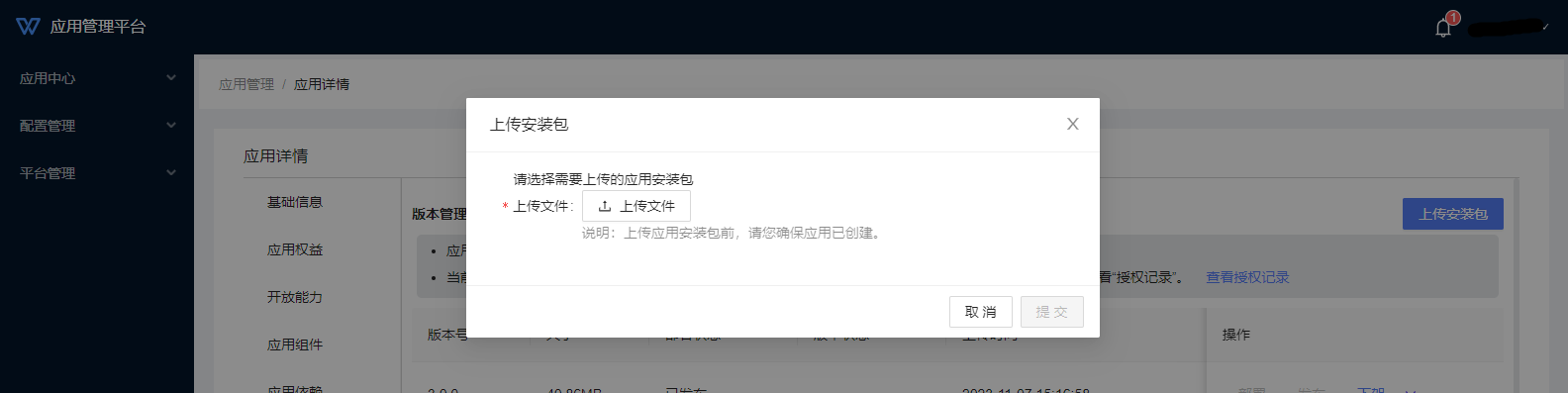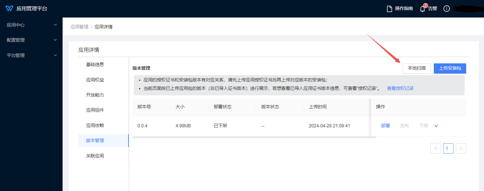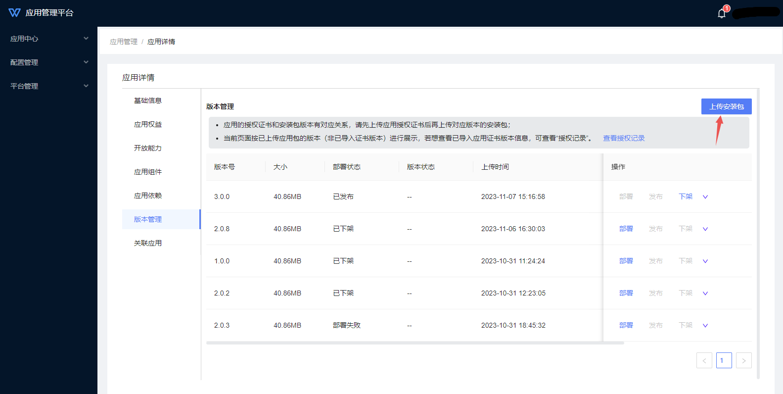 3、点击应用名称或“详情”,进入应用详情页面,在[版本管理]菜单管理应用各版本的部署。点击“上传安装包”执行安装包上传: