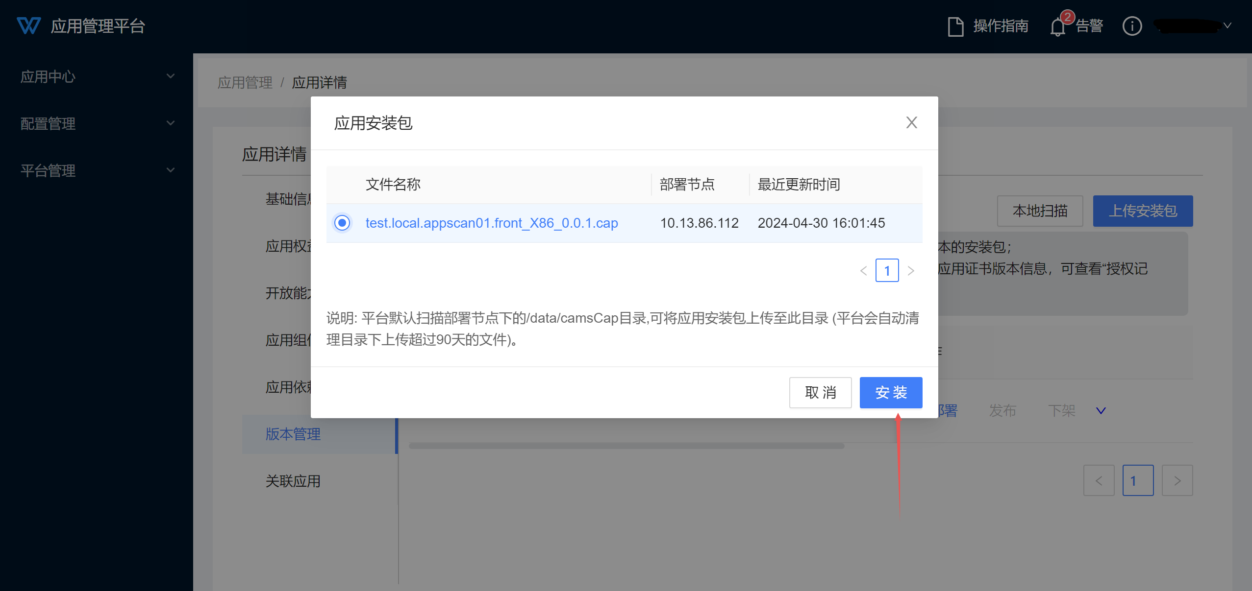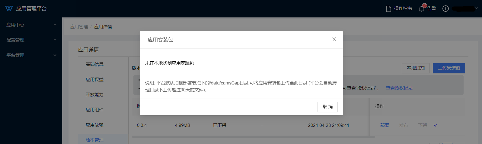 若应用安装包体积较大,可预先通过工具将安装包直接上传至服务器本地目录(部署节点下的/data/camsCap目录),再使用[本地扫描]功能获取服务器本地的安装包执行部署。