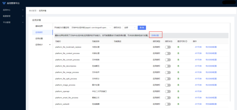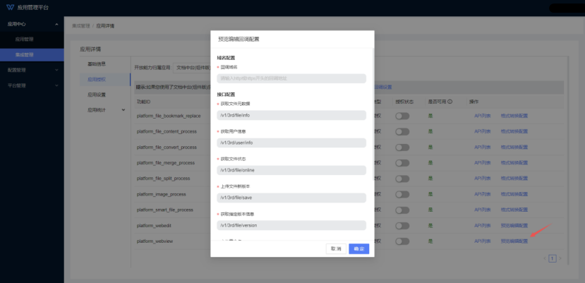 2.管理员可在”应用授权“页面切换开放能力归属应用为”文档中台“,在”操作“列分别执行”格式转换配置“、”编辑预览配置“等回调设置。