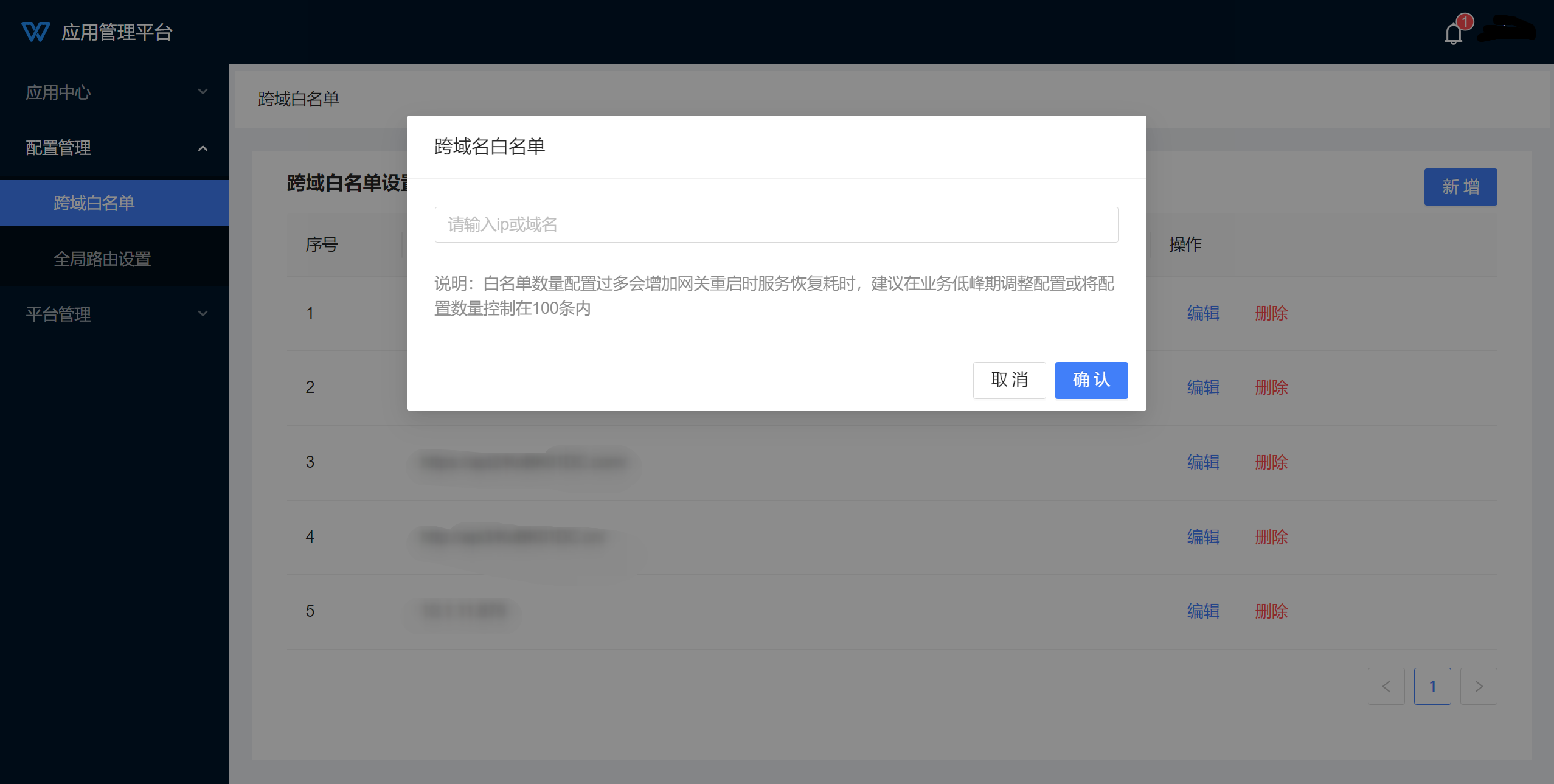 2.说明:白名单数量配置过多会增加网关重启时服务恢复耗时,建议在业务低峰期调整配置或将配置数量控制在100条内